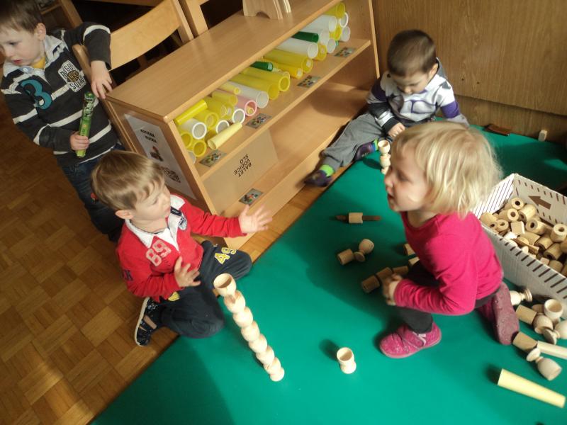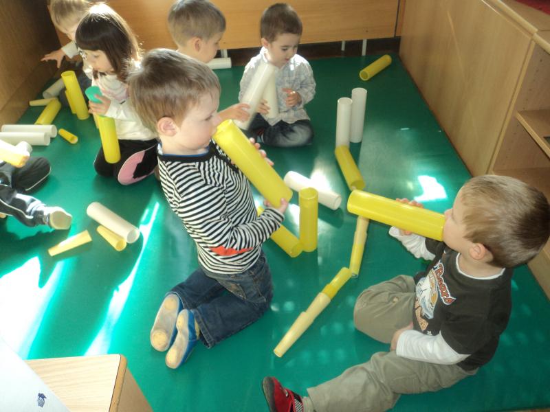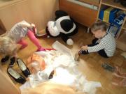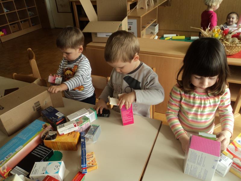 Materiale, ki so jih otroci prinašali v vrtec smo razvrščali in napolnili police kotičkov, se z njimi igrali. Sestavljali smo različne stolpe, vozila, hiše, tipali in prisluhnili različnim zvokom, si oblačili različna oblačila in obuvali nekoliko prevelike čevlje. Pri tem pa smo se predvsem zabavali in se nasmejali. Čaka pa nas še ena pomembna naloga, saj še zbiramo ideje da se dogovorimo kaj bomo naredili z zalo veliko škatlo. Pri tem pa bomo povabili na pomoč tudi otroke iz sosednje skupine.